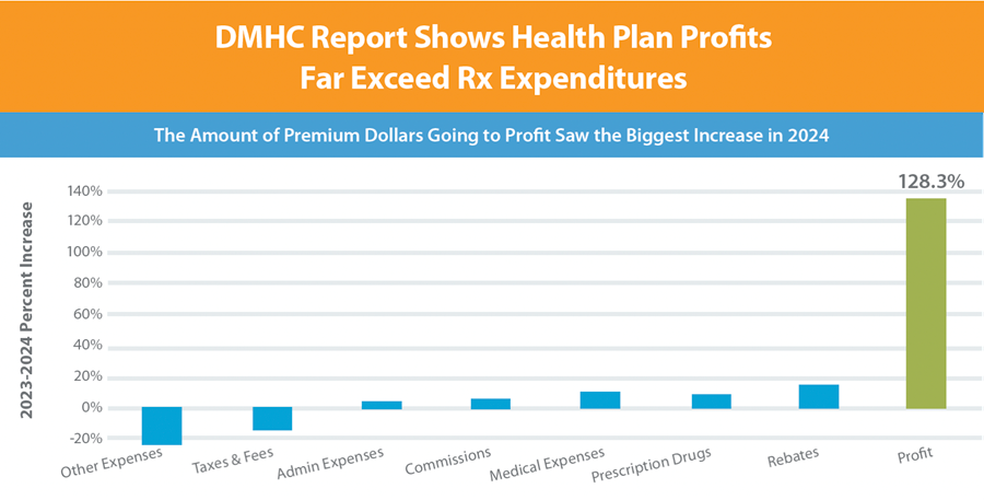 According to the DMHC’s own data, health plan profits surged from $399 million in 2022 to $2.9 billion in 2024—a staggering 626% increase in just two years. At the same time, prescription drugs accounted for only about 11–12% of premium spending, remaining relatively consistent over time.